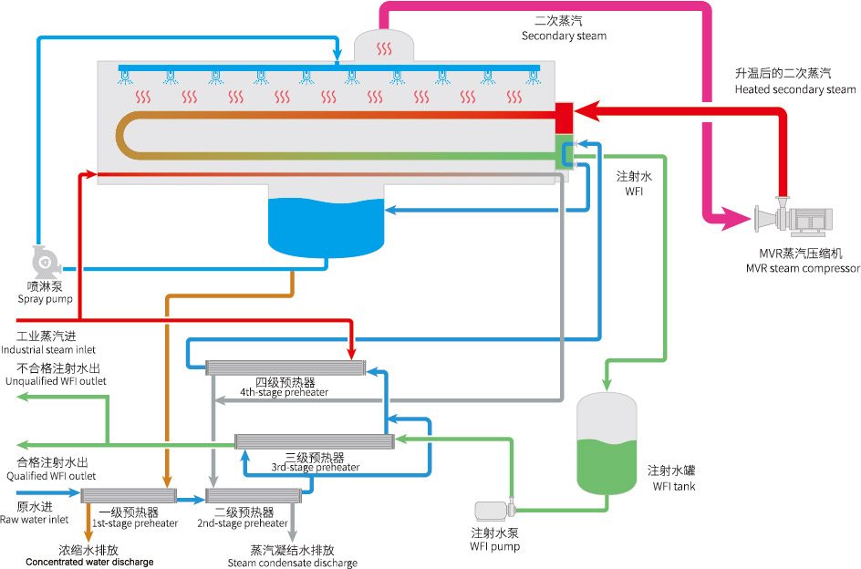 仲博CBIN99最新研发生产的热压蒸馏水机使用了MVR节能技术,具有产水优质、节能效果显著、安装使用灵活等优点。仲博CBIN99热压蒸馏水机产量可从1T/h至100T/h[1],既可为客户提供大处理量中心式制水方案,基于其超低的产量范围和撬装模块化设计,也可为客户提供灵活的分布式注射用水生产解决方案。